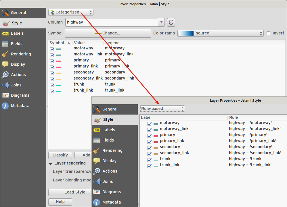 • Classes are automatically converted from categorised and graduated classes when switching to rule based renderer.