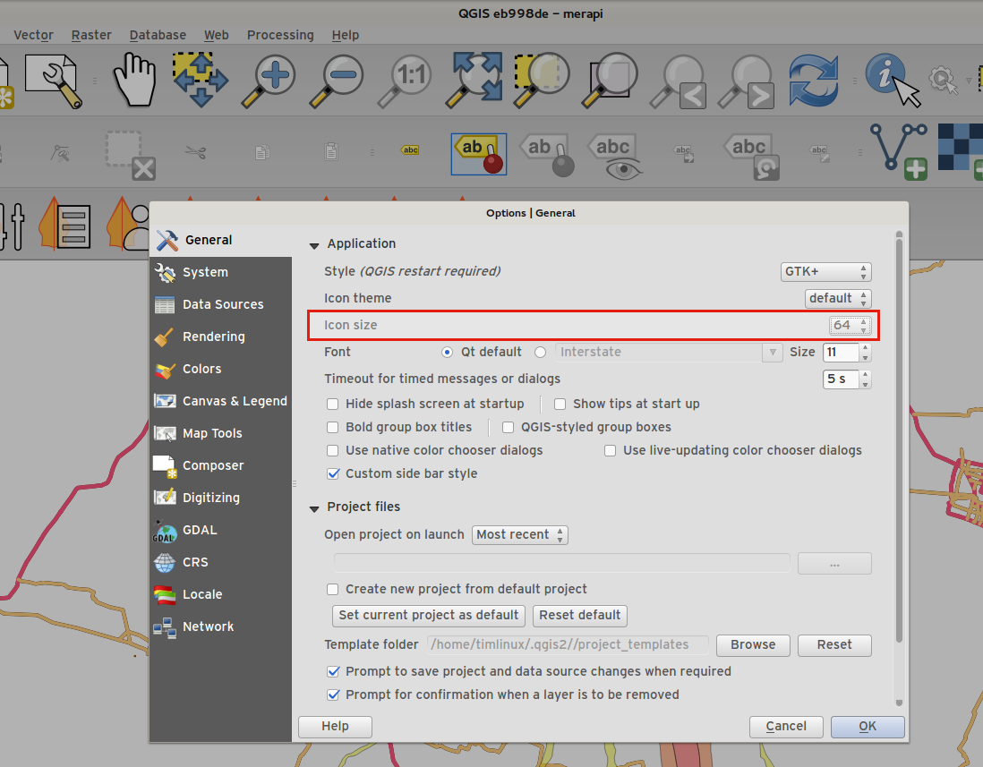 For those using QGIS on touch devices (or if you just like big, chunky icons), you can now set the icons up to 64 x 64 pixels in size.